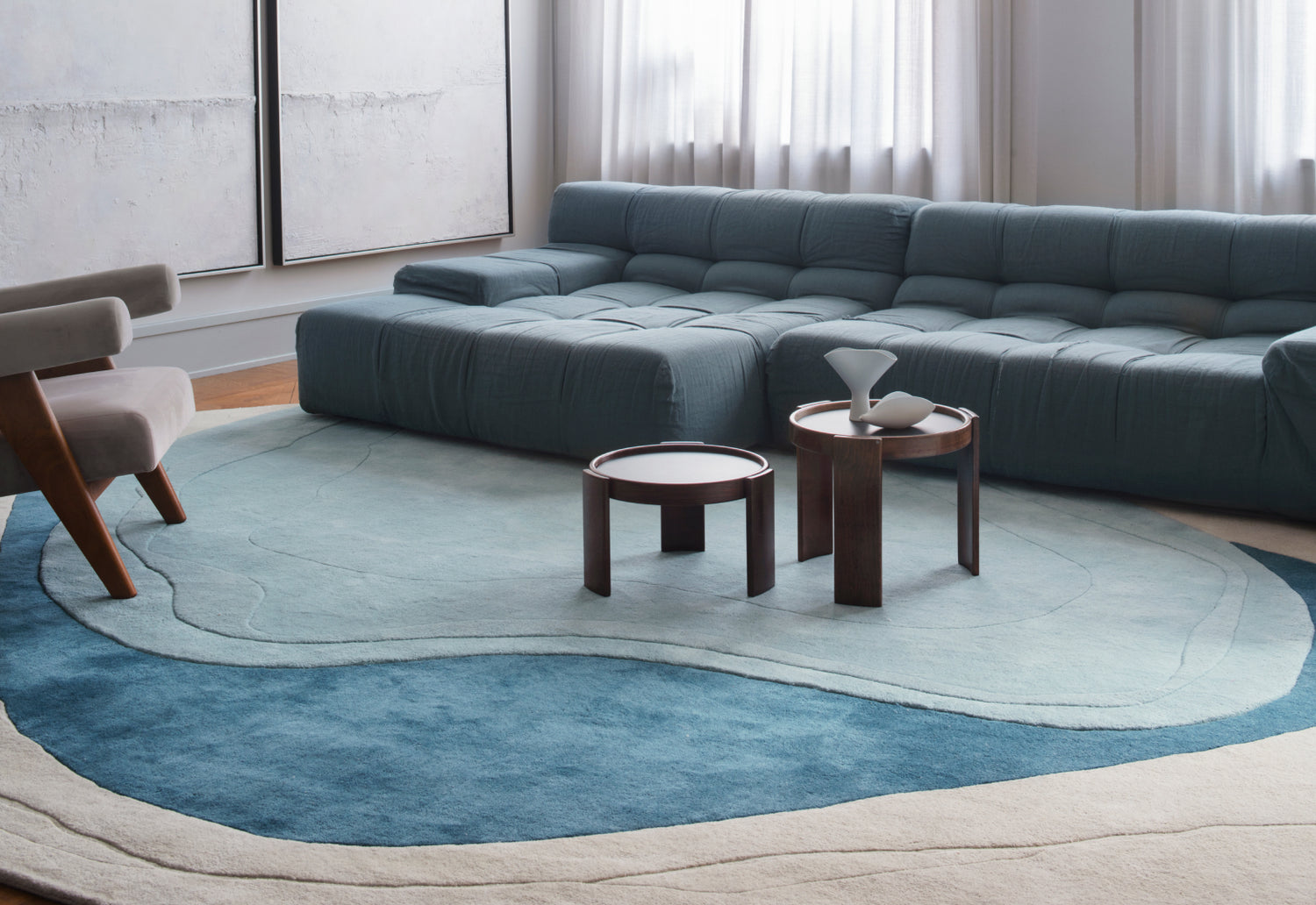 Front legs of sofas and armchairs should rest on the rug. Rug should extend about 20–30 cm beyond the furniture.