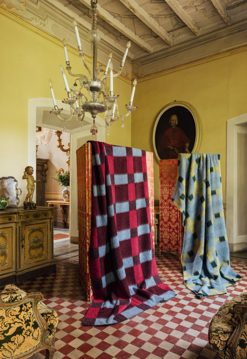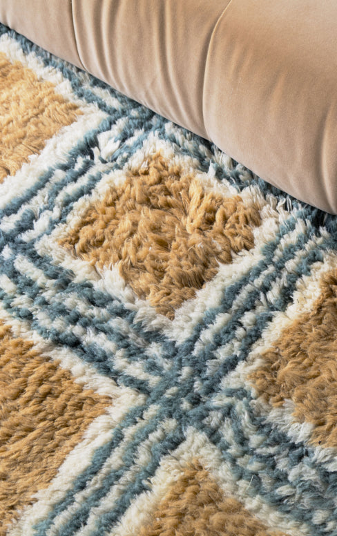 The collection is released in three drops: the first features handcrafted wool rugs and oversized mohair blankets, while the second introduces a jute series inspired by Evelina’s signature graphic style and the new third collection featuring a collection of hand-knotted rya rugs in 100% New Zealand wool.