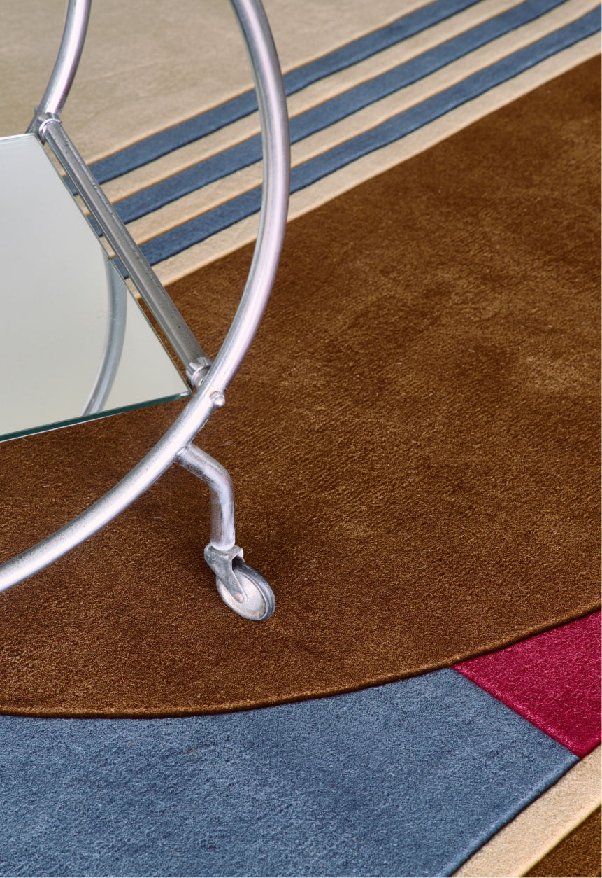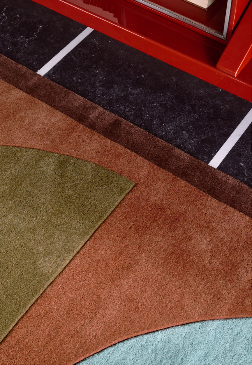 The collection comprises three designs, each with its own geometric rhythm. Coppa Canella is built on a vertical flow of half circles in muted earthy tones, Mezza Confetto plays with circular compositions in contrasting shades, and Doppio Rosa balances two defined colour fields framed by linear structure. Each rug is hand-tufted in 100% wool by skilled artisans in Bhadohi, India. Every colour field is carefully hand-cut to create subtle height variations and a tactile surface that enhances the pattern.