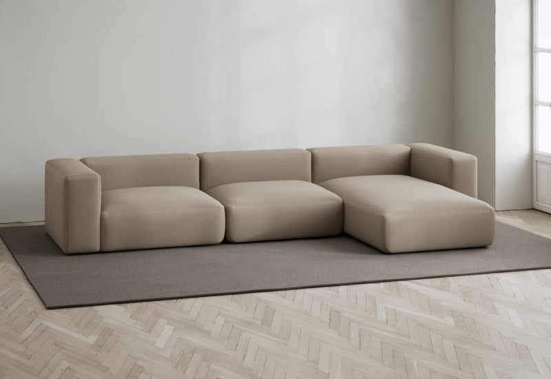 Bredde: 324 cm, Dybde: 162 cm, Høyde: 60 cm, Setebredde: 270 cm, Setedybde: 142 cm, Sittehøyde: 35 cm, Armlener: 27 cm. Stoffet er ikke avtakbart.