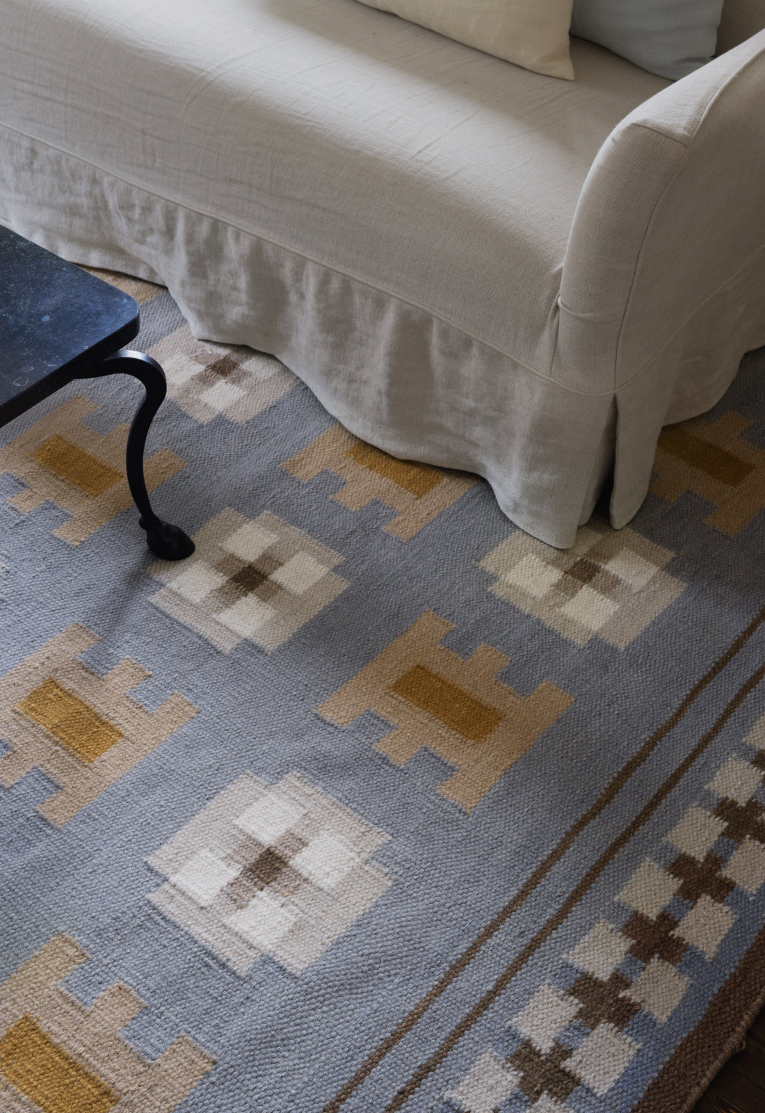 Denne teppekolleksjonen kommer med farger og mønstre som bærer sterk kulturell og estetisk betydning – en hyllest til tradisjonelt skandinavisk kvinnelig håndverk. Alle teppene er håndvevde, med en horisontal innslagstråd av 100% ull og en vertikal renning av 100% bomull.