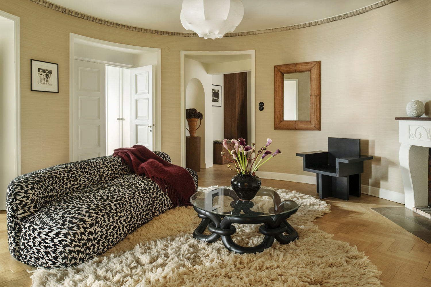 "Hele den runde rommet er min favoritt og grunnen til at vi impulsivt kjøpte denne leiligheten. Jeg elsker de speilbelagte dørene, peisen og den nesten 100 år gamle dekorative takmalerien. Alt passer perfekt sammen med vår utrolige buede sofa i et print designet av Eley Kishimoto."