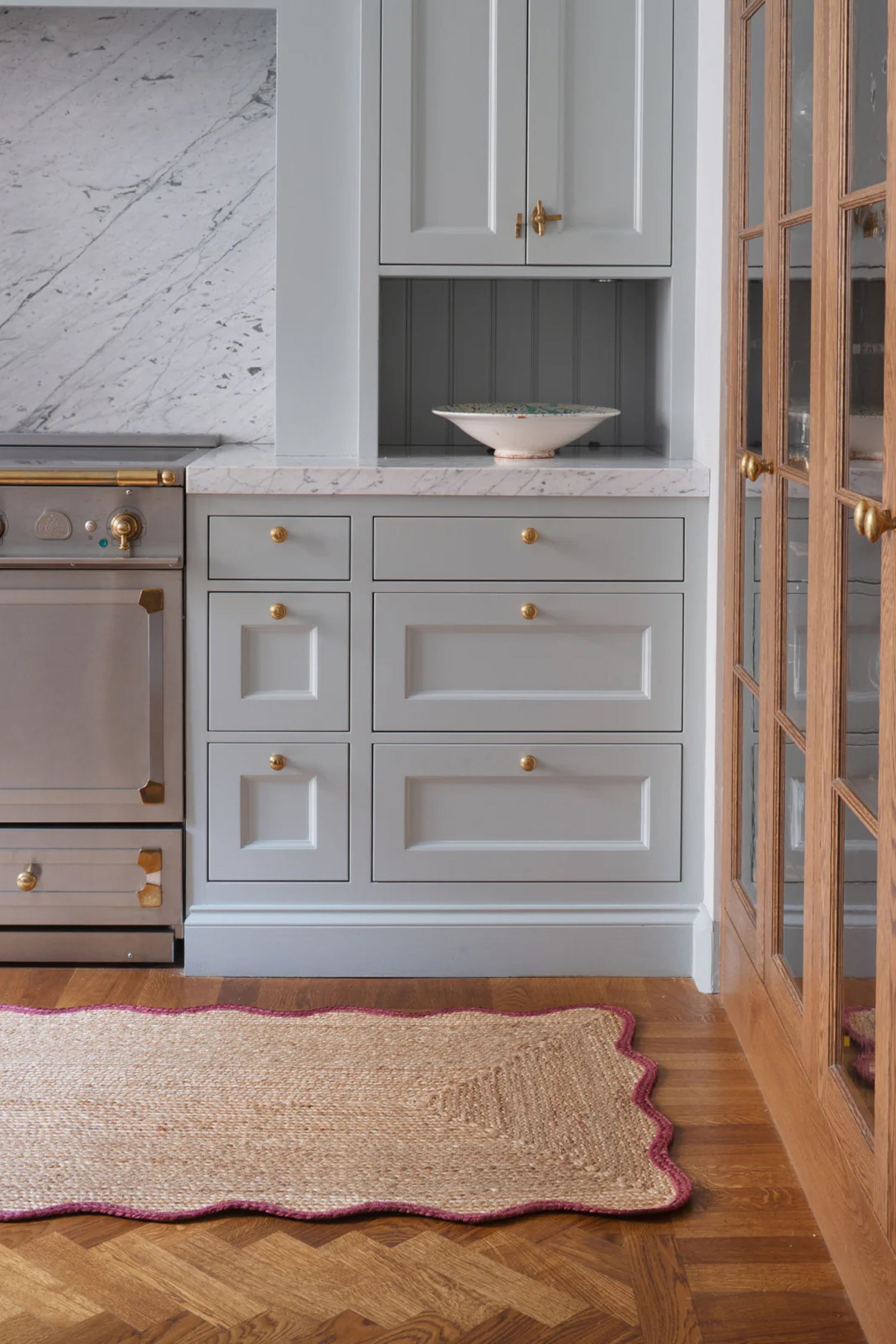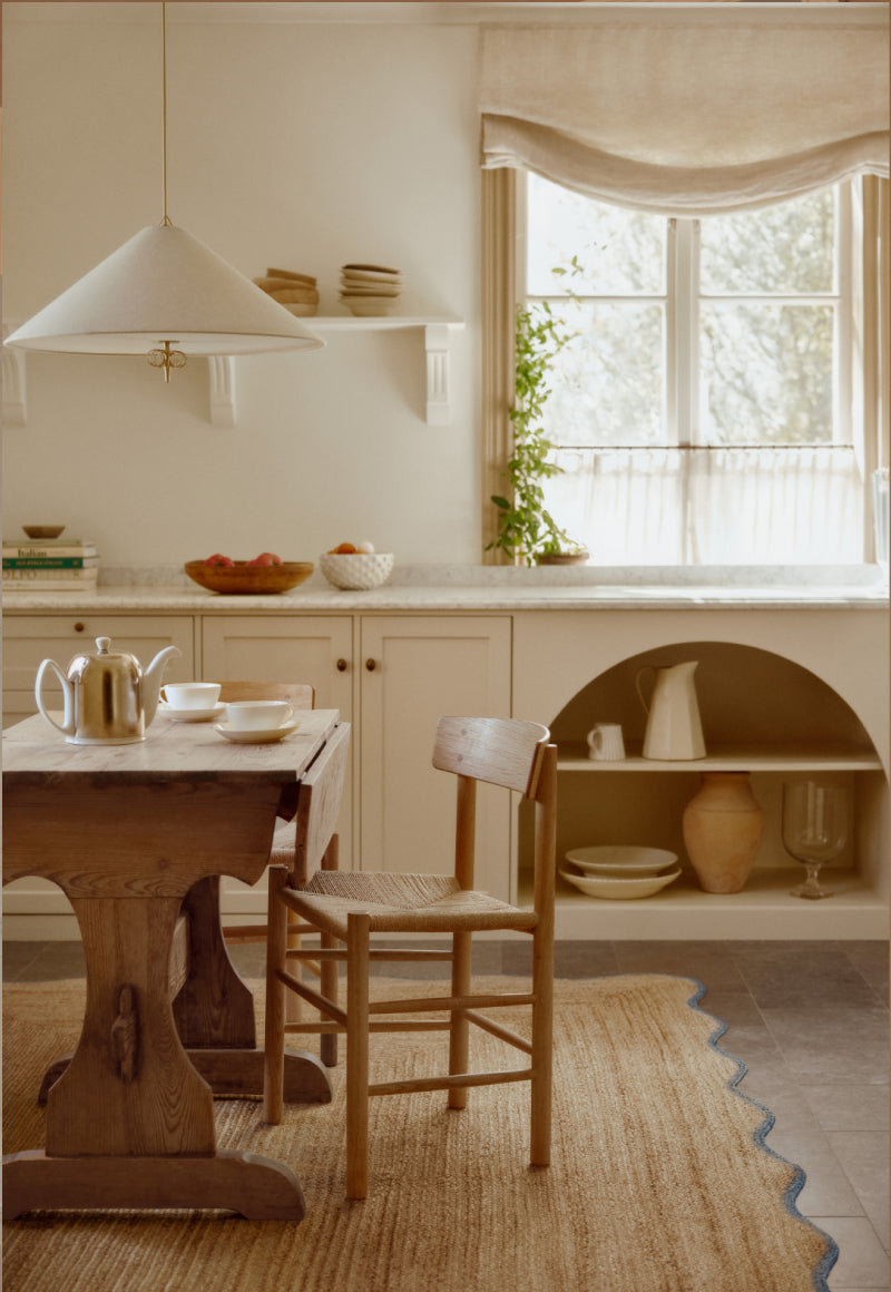 Formgitt i Stockholm og håndvevd i 100 % jute av dyktige håndverkere i India. Teppets naturlige nyanse rammes inn av et kraftig bomullsbånd som skaper en harmonisk kontrast. For å bygge de organiske formene, flettes juten og formes i tette spiraler. Til forskjell fra rustikk jute gir dette en mykere fremtoning. Mangel på bakside gjør teppet både fleksibelt og elegant.