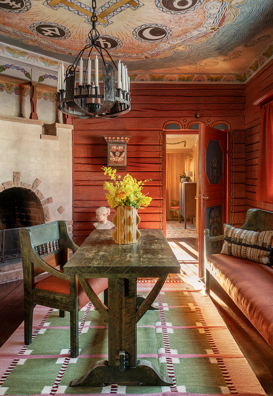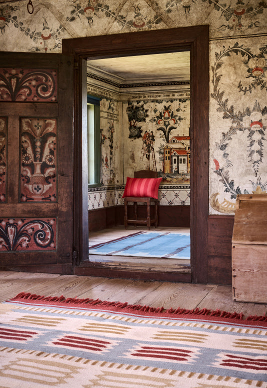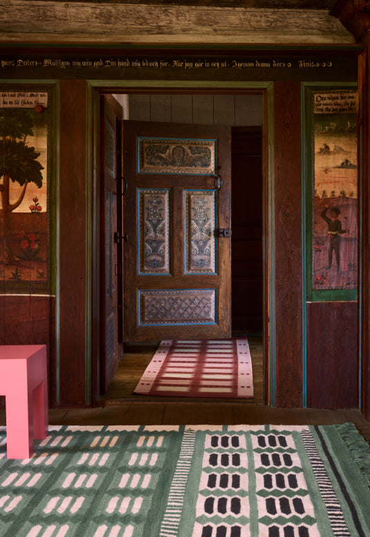 Det tradisjonelle svenske Röllakan-teppet er et vevd teppe som kjennetegnes av geometriske og stiliserte mønstre. Opprinnelig ble Röllakan-tepper vevd hjemme av kvinner som en del av gårdens eget håndverk og går ofte i arv som familieklenodier. Med den nye Röllakan-kolleksjonen har LAYERED gjenopplivet disse klassiske elementene og gitt dem et moderne og harmonisk uttrykk.