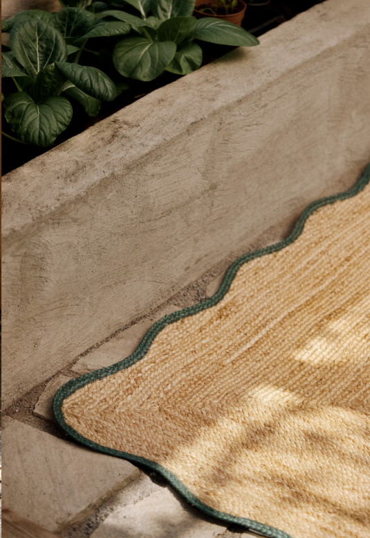 I en mix av lekfullhet och italiensk elegans består scallop collection av den böljande scallop-kanten, som tillför en subtil men iögonfallande detalj. Den naturliga jutefärgen ramas in av en accentfärgad kant som skapar en harmonisk kontrast. För att få fram de mjuka formerna har juten flätats och lindats i cirklar, och varje matta avslutas med en kant i en noggrant utvald accentfärg.