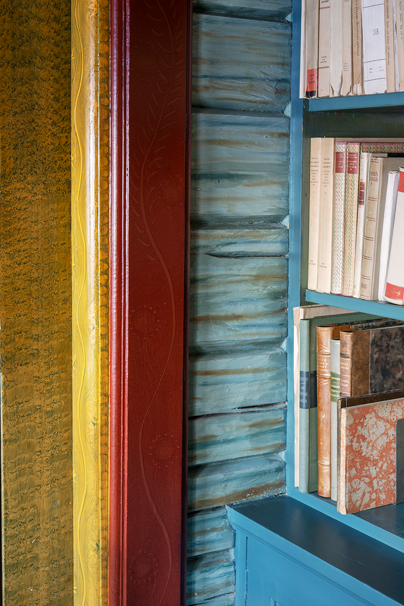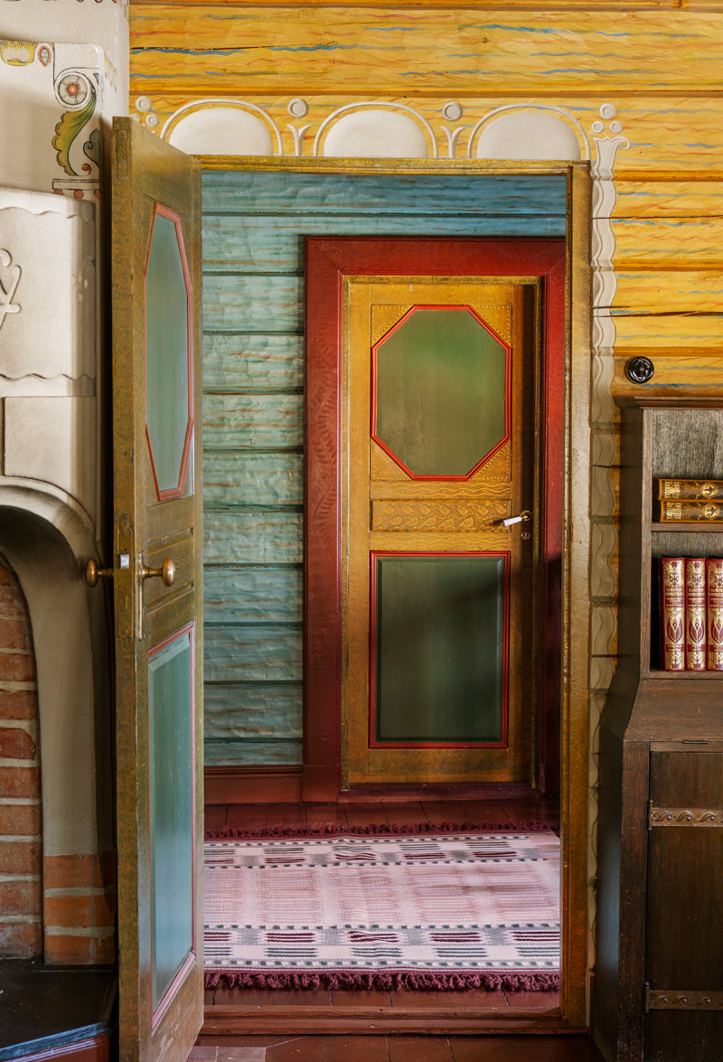 “Jag skulle säga alla de oväntade detaljerna i timret, både inne och utomhus. Huset kännetecknas av engelska influenser och Arts and Crafts, och är rikt på dekorativa inslag - små djur- och blommotiv dyker upp lite var stanns. Färgvalen från tidigt 1900-tal är fullständigt oväntade, där blått möter rött, gult, turkost och grönt i en salig röra på samma yta, vilket ändå lyckas gifta sig till succé.”